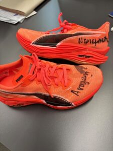 Signed shoes of Olympian Antigoni Ntrismpioti, worn during the meeting in Dublin where she secured her qualification for the World Championship.